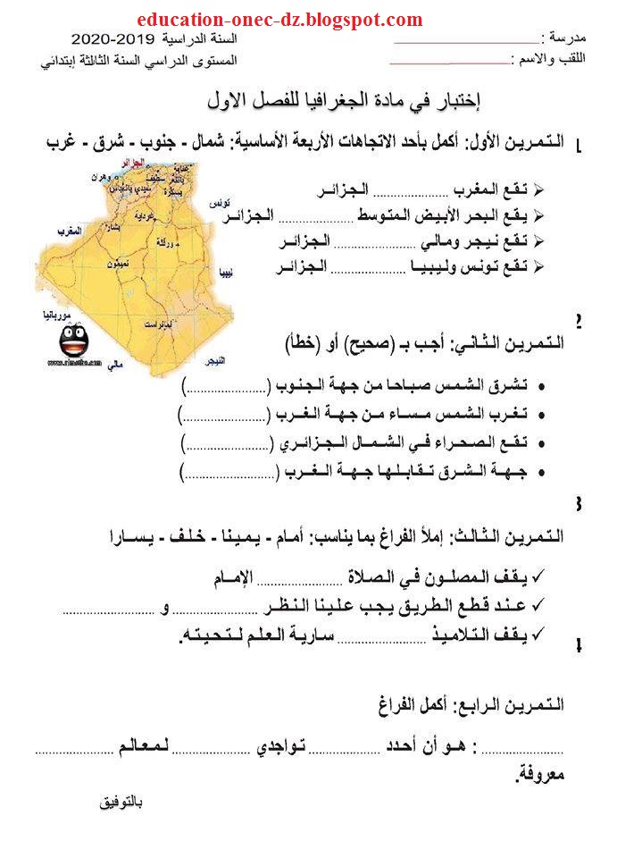 اختبار رقم 1 للثلاثي الاول في الجغرافيا سنة ثالثة ابتدائي الجيل الثاني 2019 2020